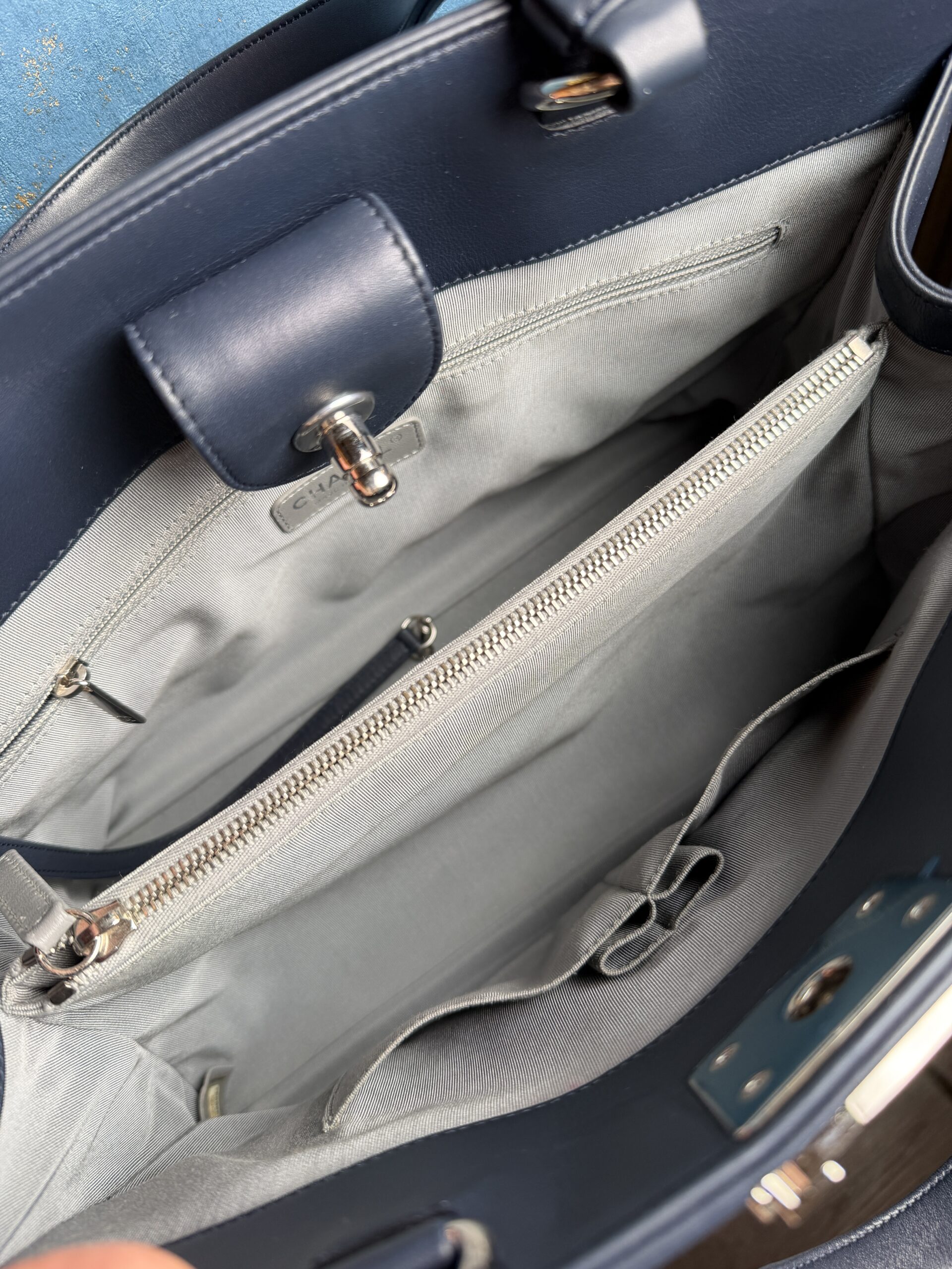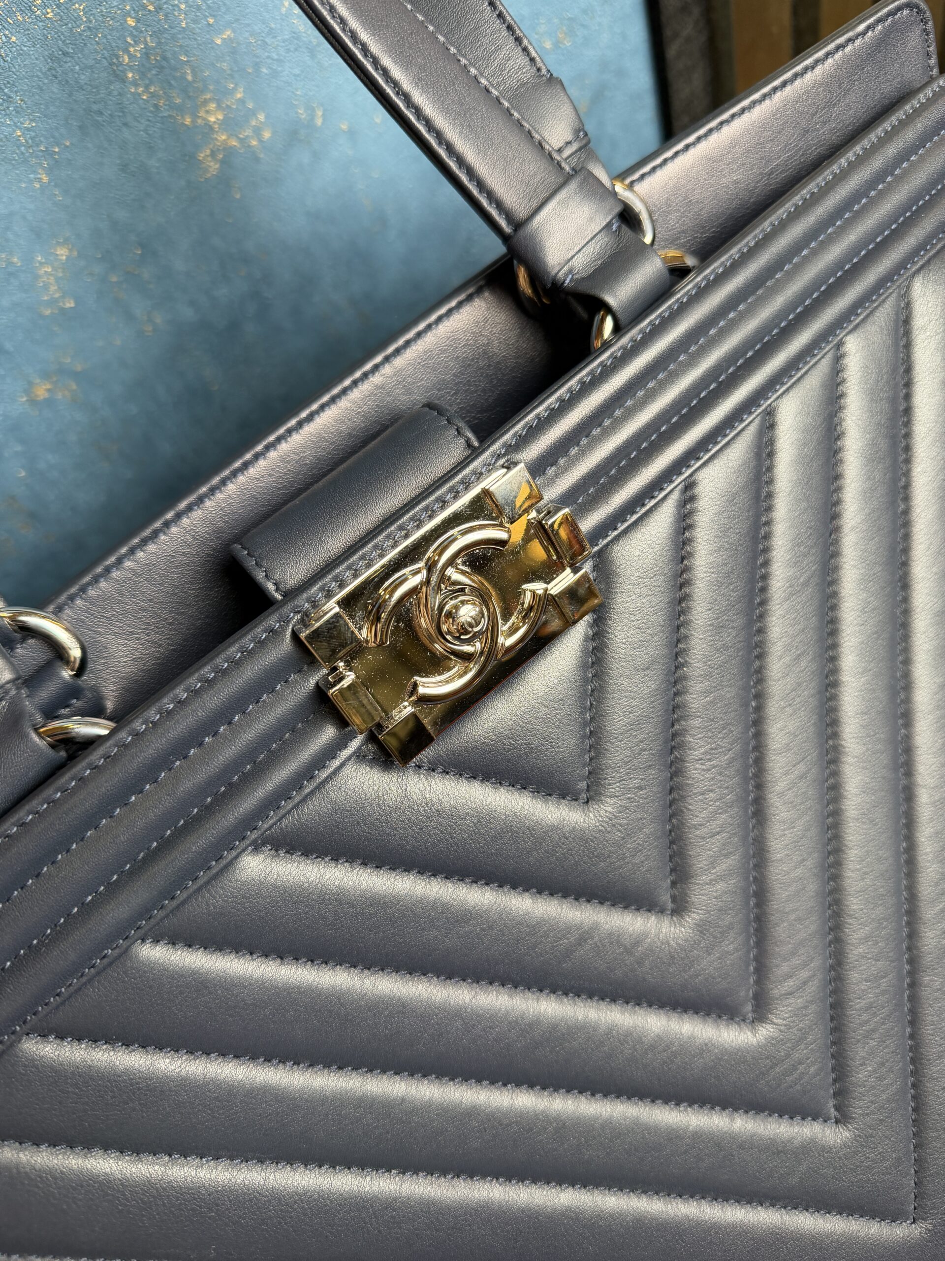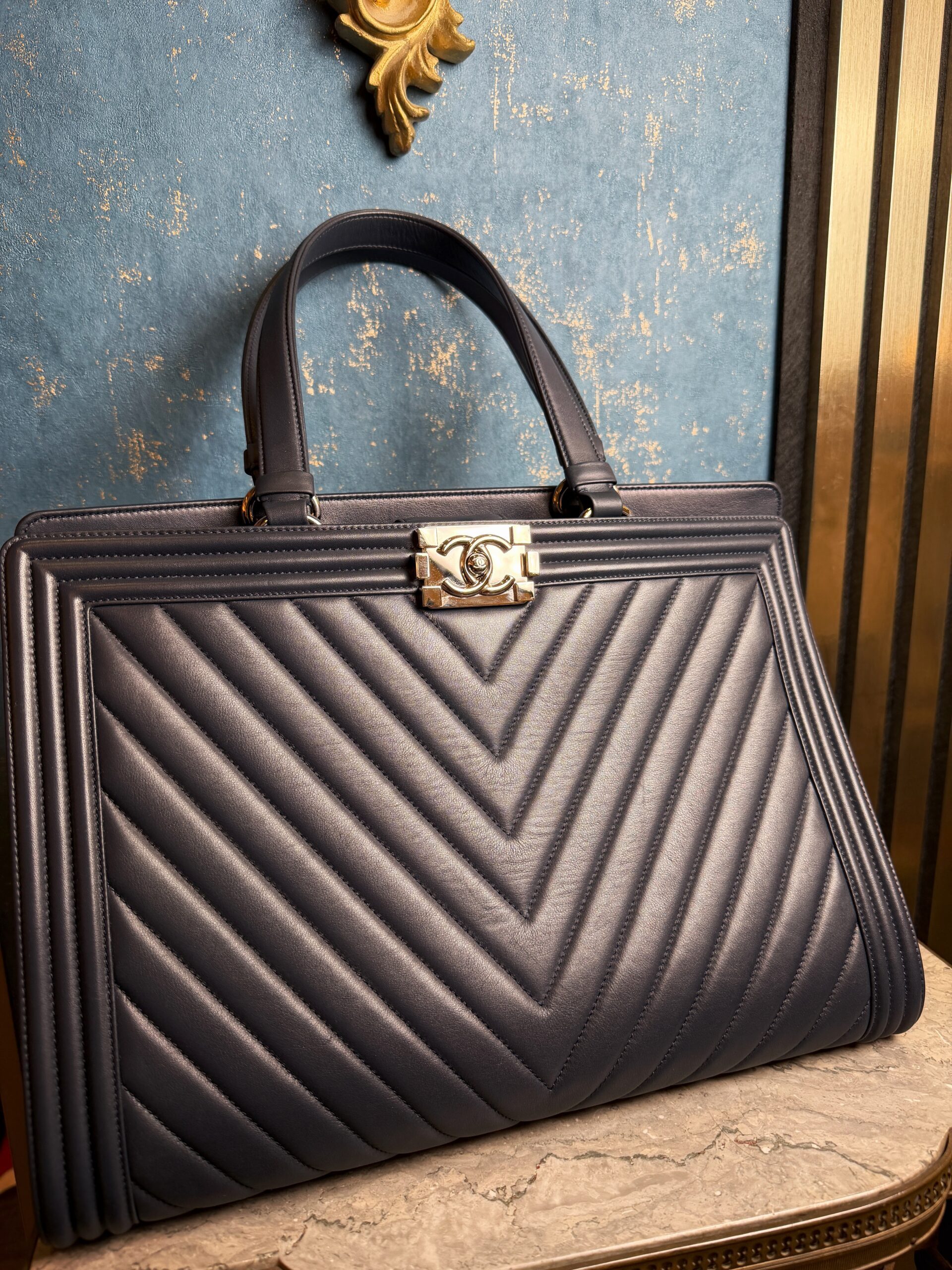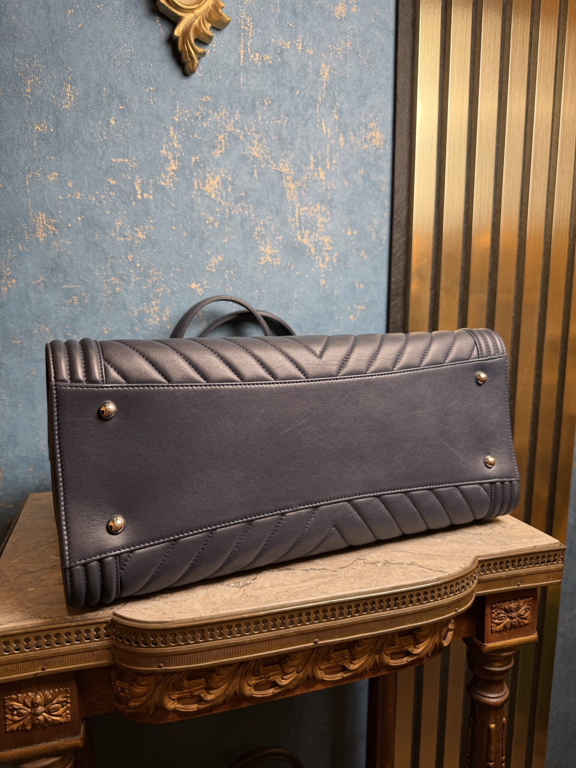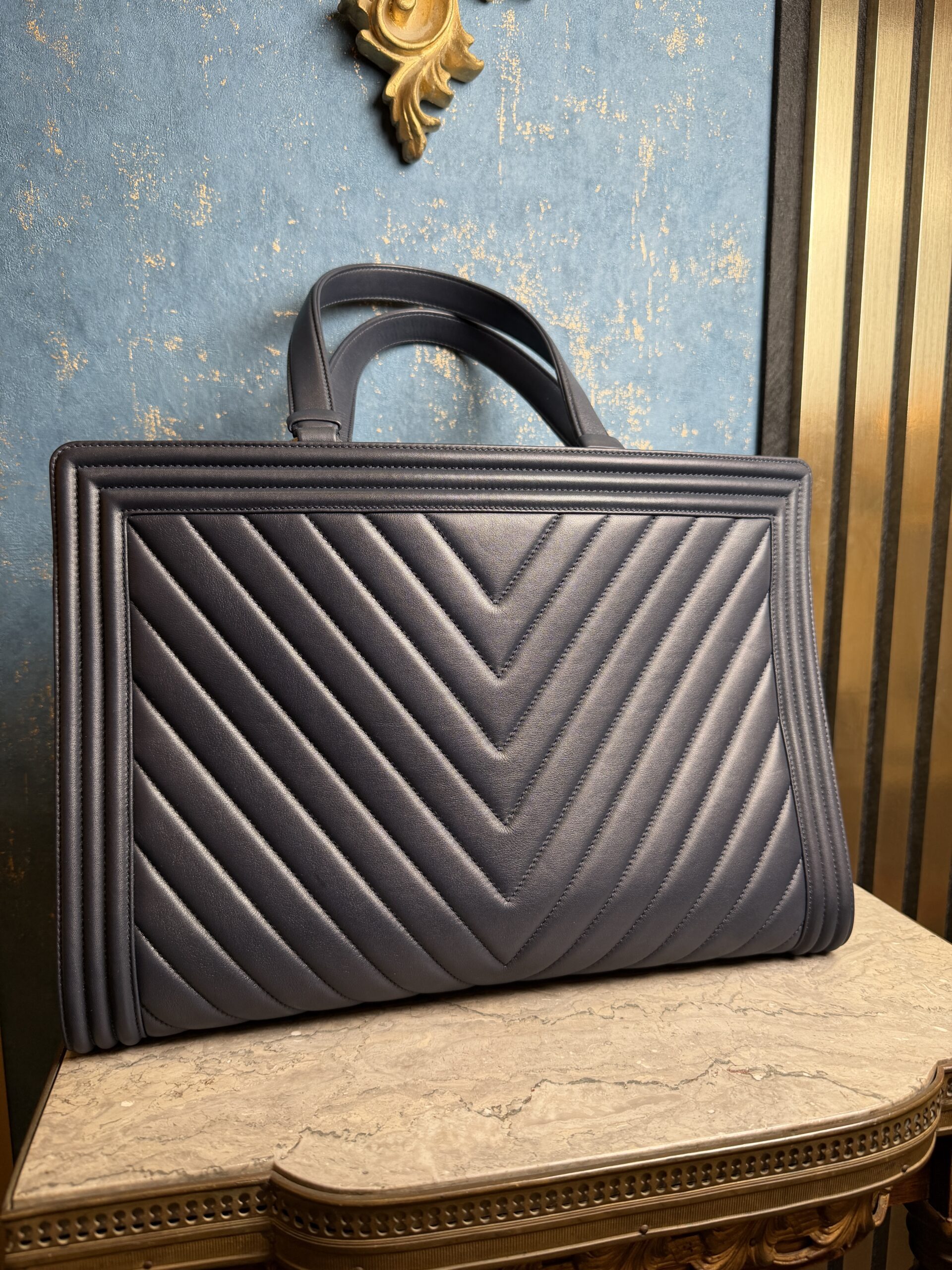 Chanel Boy kabelka v tmavě modrém odstínu a jemné kůži ve vzoru chevron. Stav 9.9/10 – jako nová, profesionálně vyčištěná. Je včetně dustbagu a certifikátu.