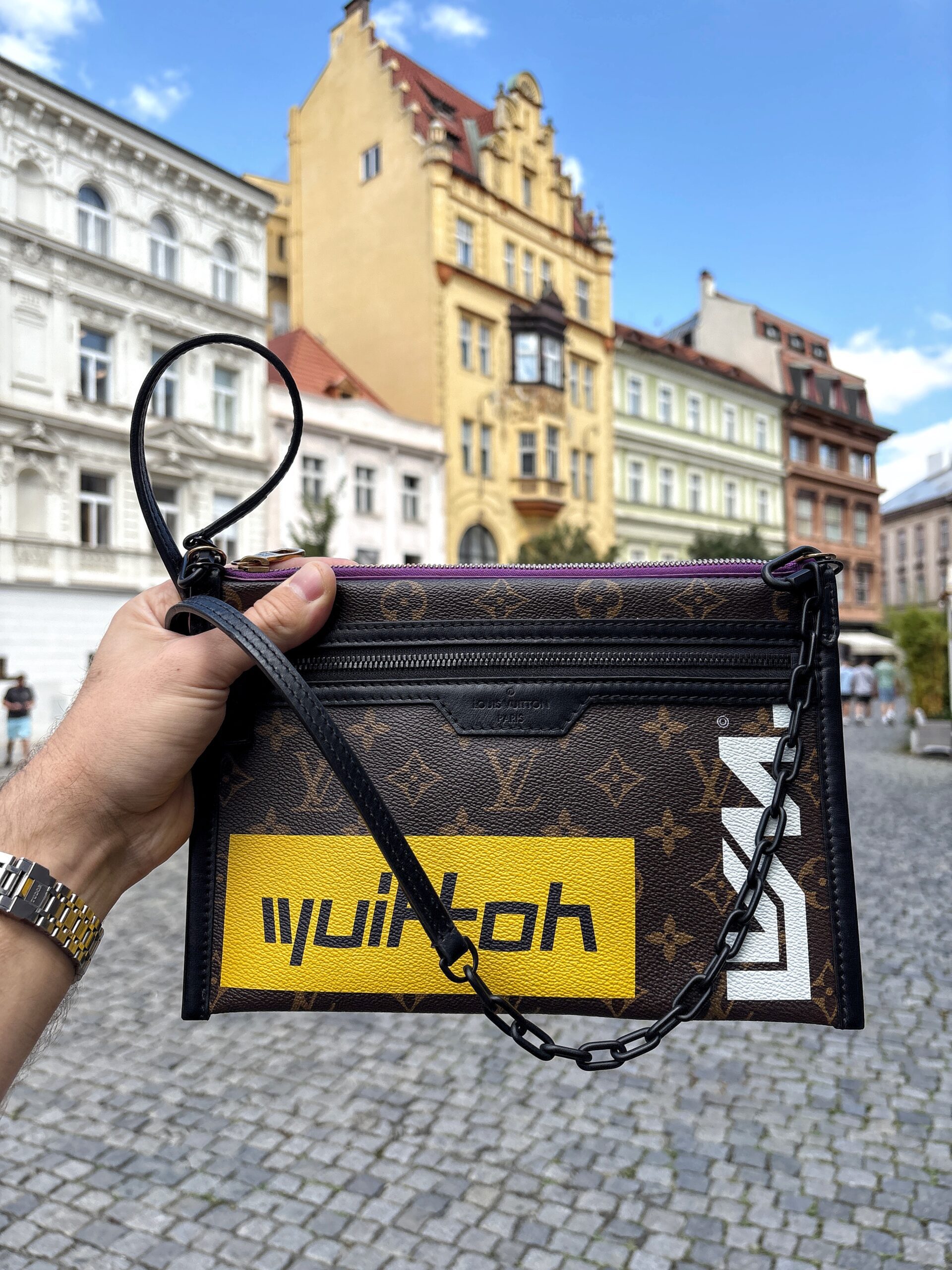 Messenger set (2ks) z kolekce Virgil Abloh 2019. Zajímavý kousek, kdy jeden messenger je pokrytý stickers (z obou stran) a druhý je fialový s vyšitým logem monogram.