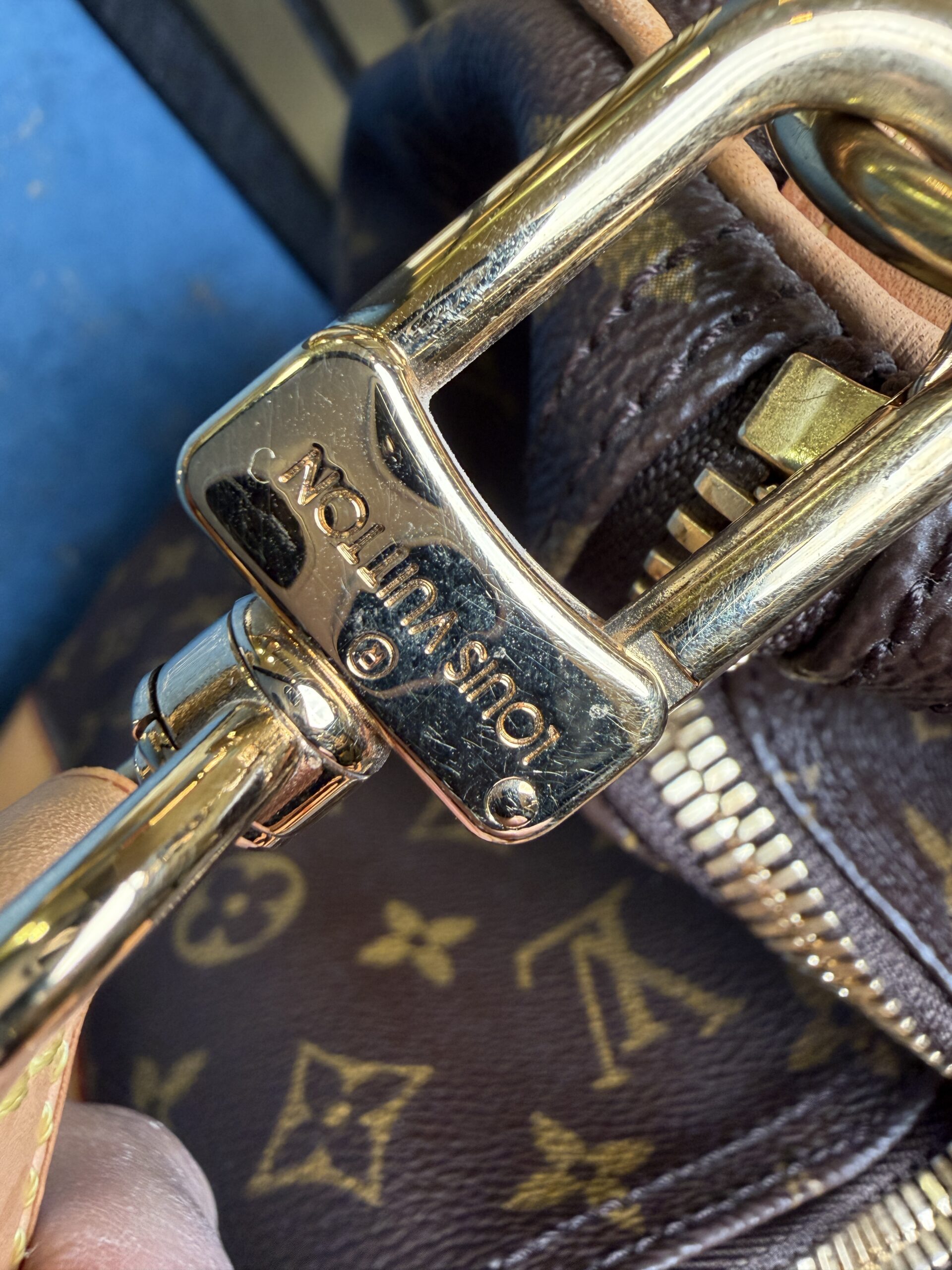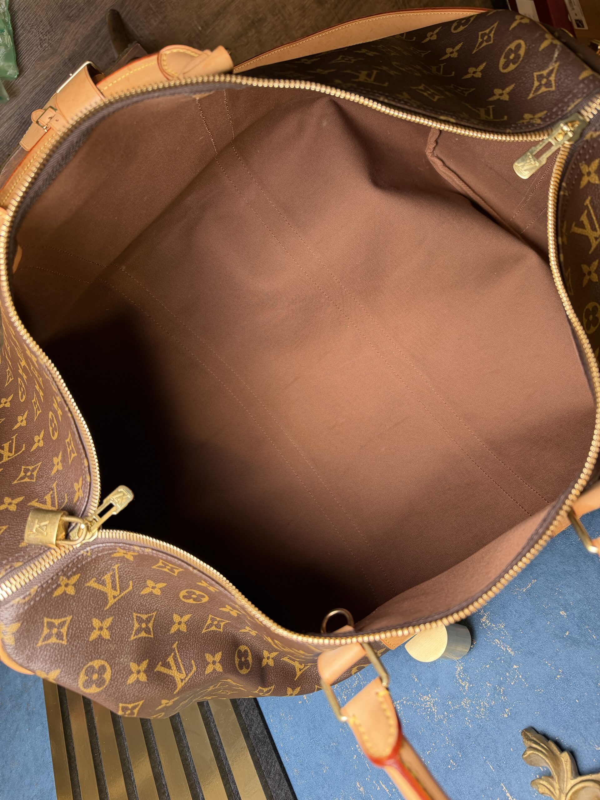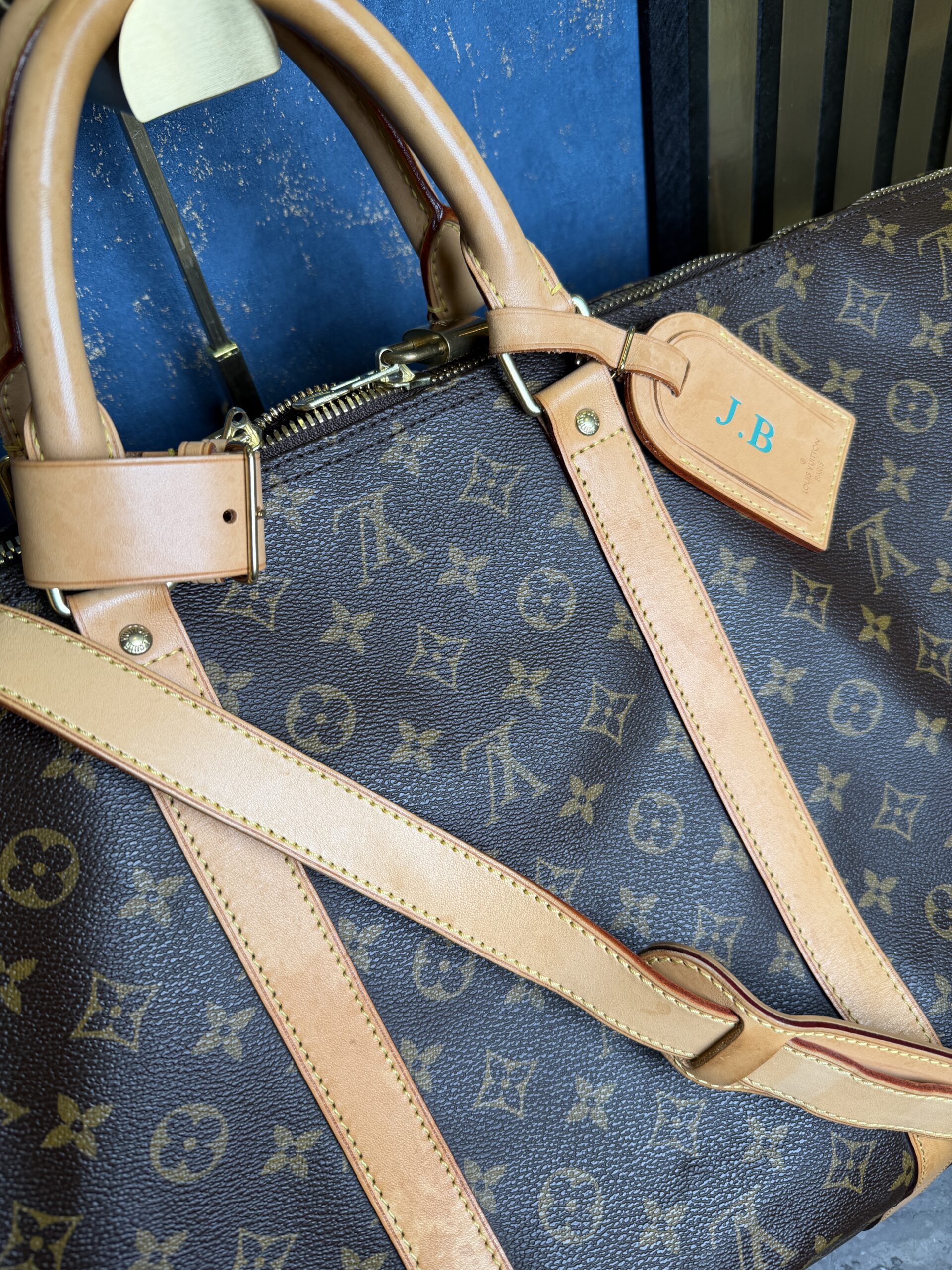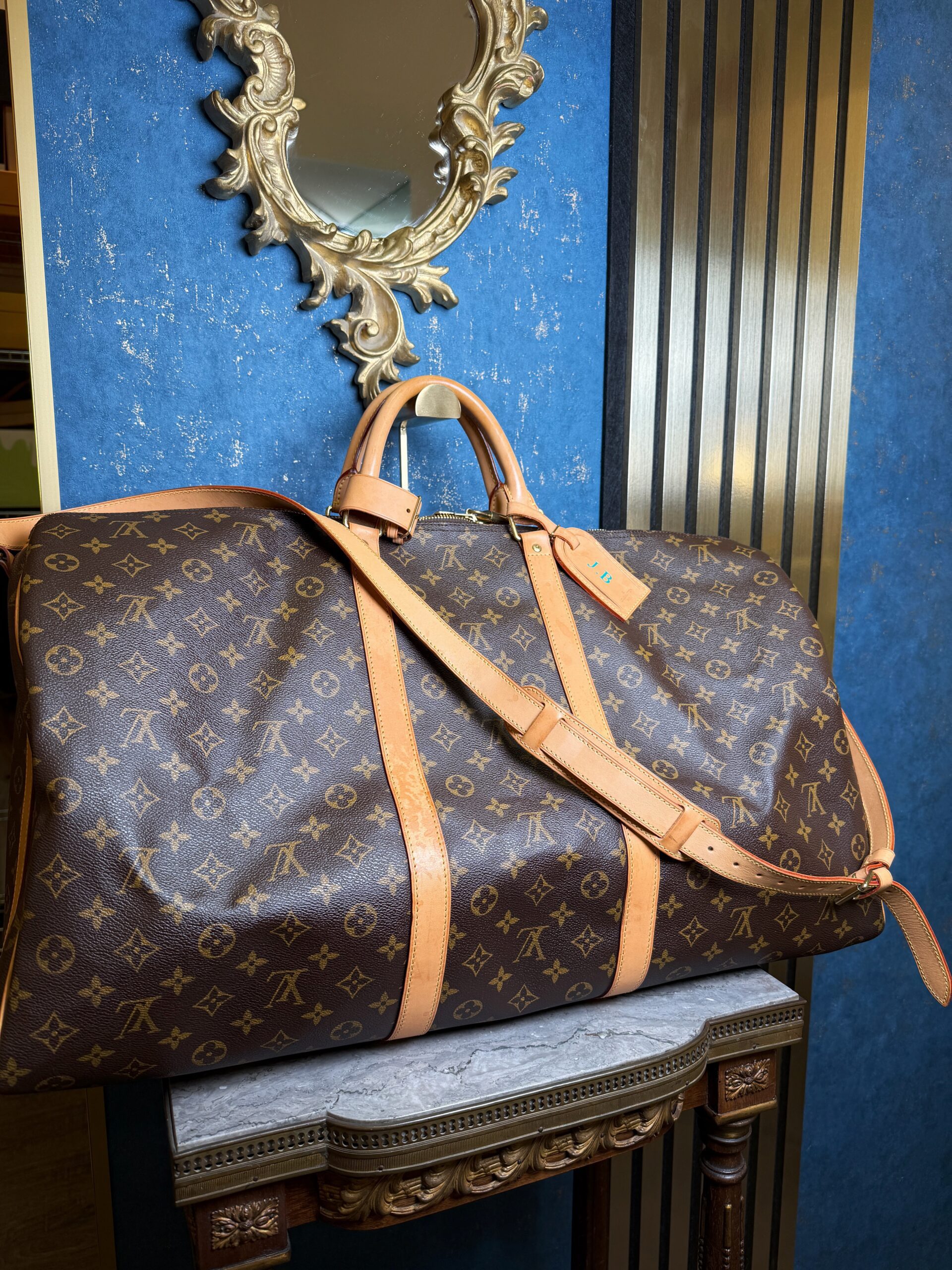 Keepall Bandouliere ve velikosti 60. Tento kousek je z roku 2008, stále je ale ve skvělém stavu bez vad, má jen lehkou patinu. Nametag má inciály JB a zámek nemá klíč.